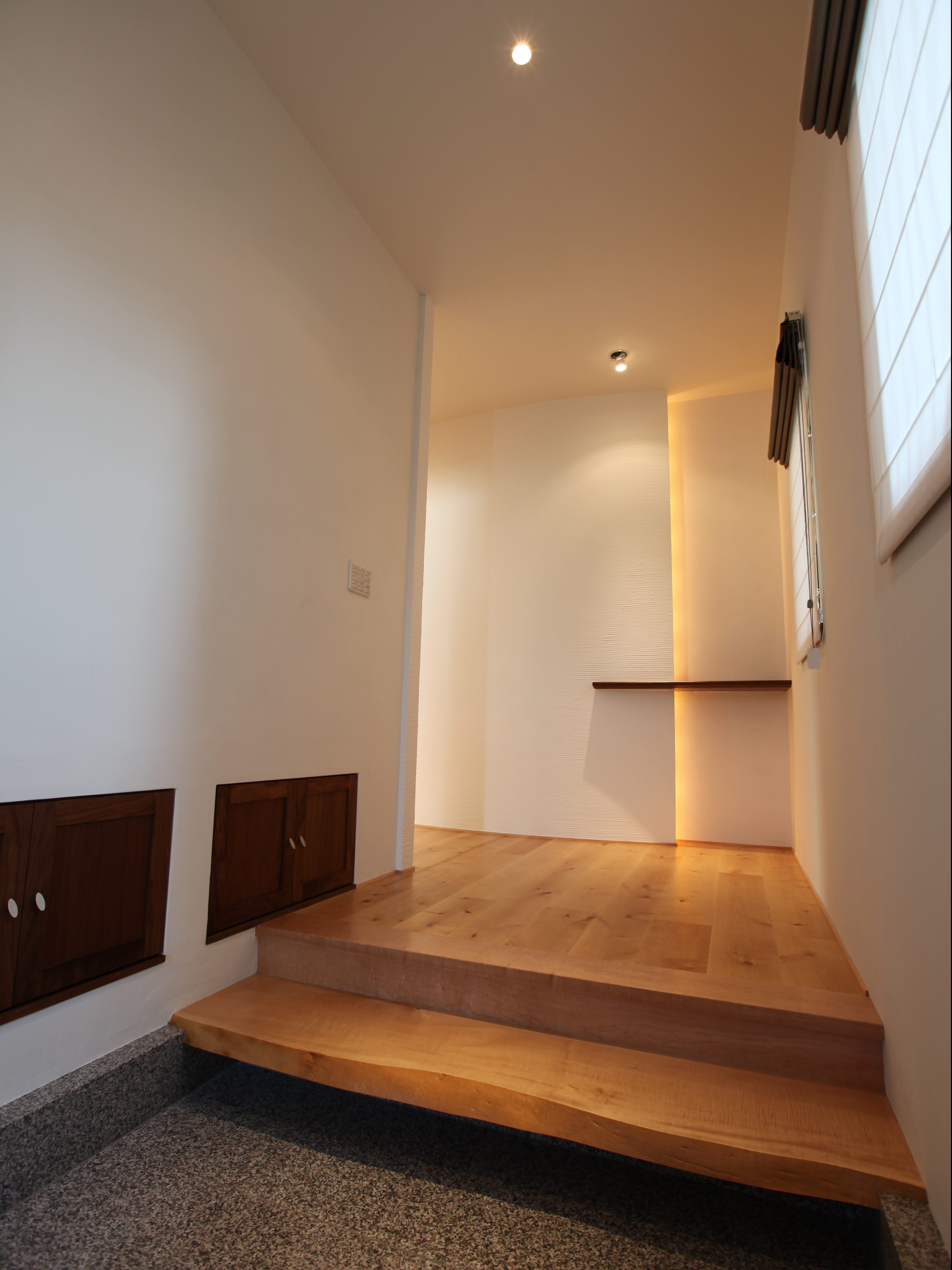 『和』がコンセプトのひとつであるこちらの新築注文住宅は玄関周りもすっきりとした面持ちで、間取りへのこだわりも曲線の壁面で間取り構成も理想通り。お客様のこだわりがカタチとなるオーダー家具が辻ウッドテクニカルのこだわりです。